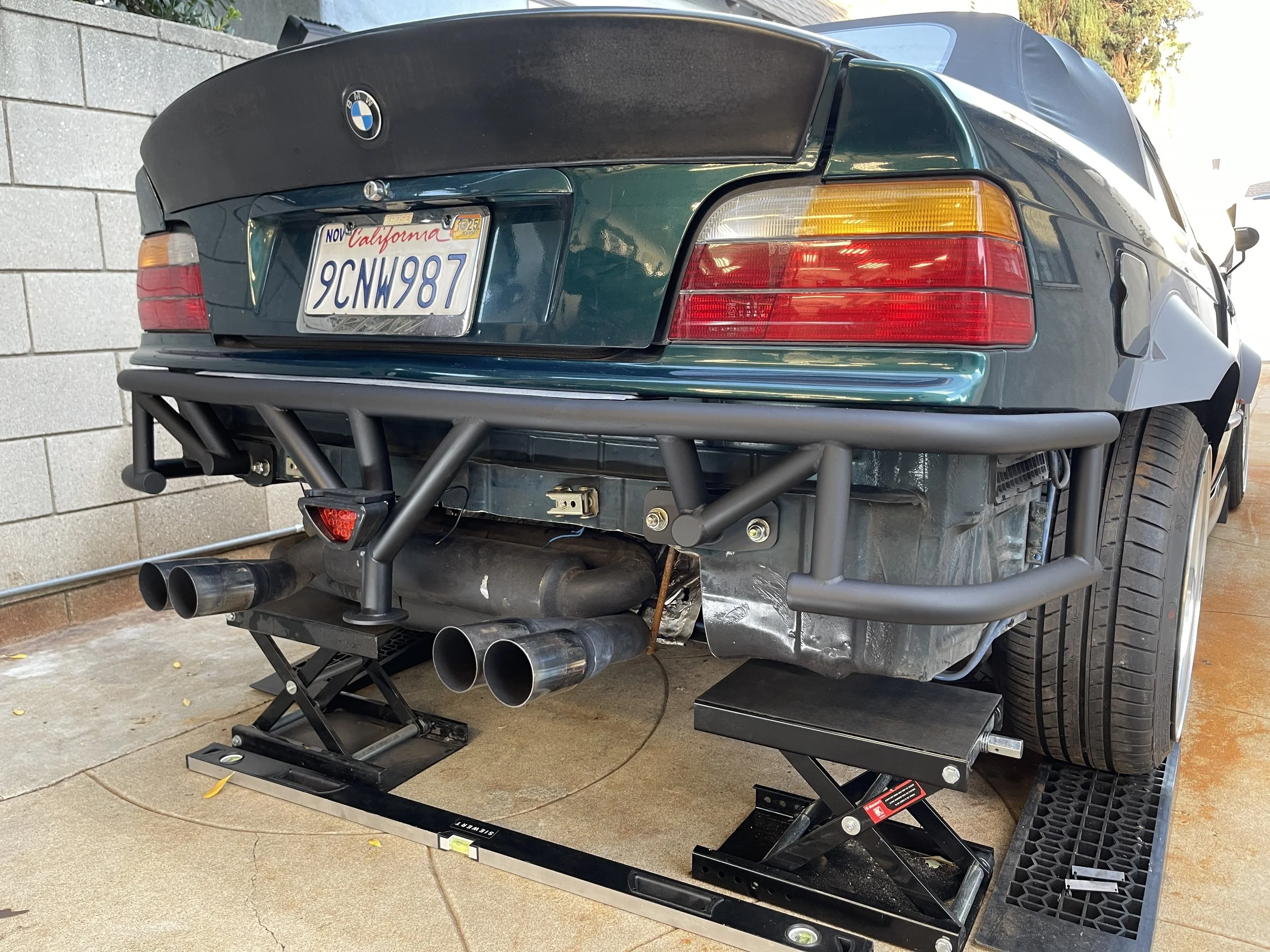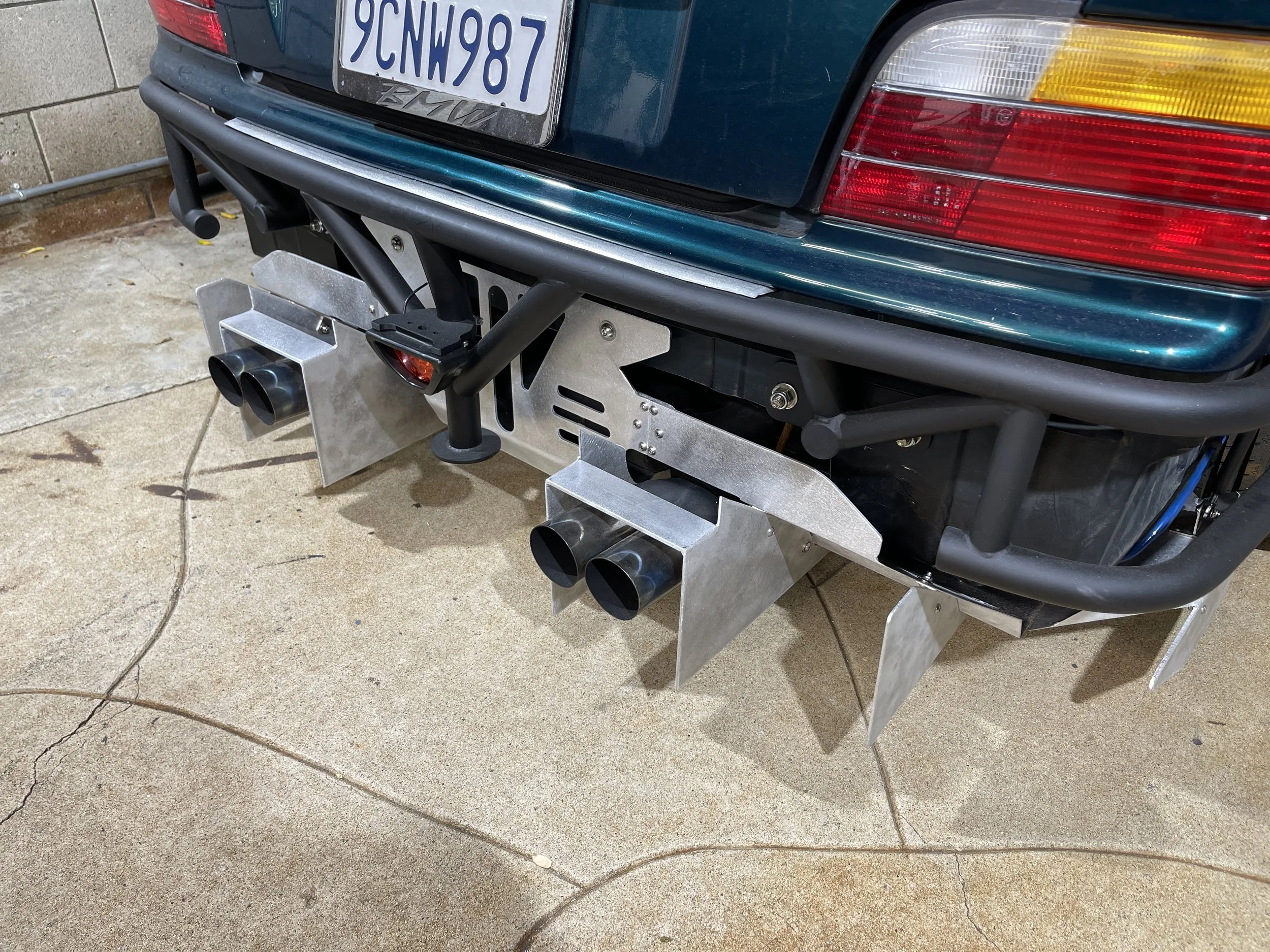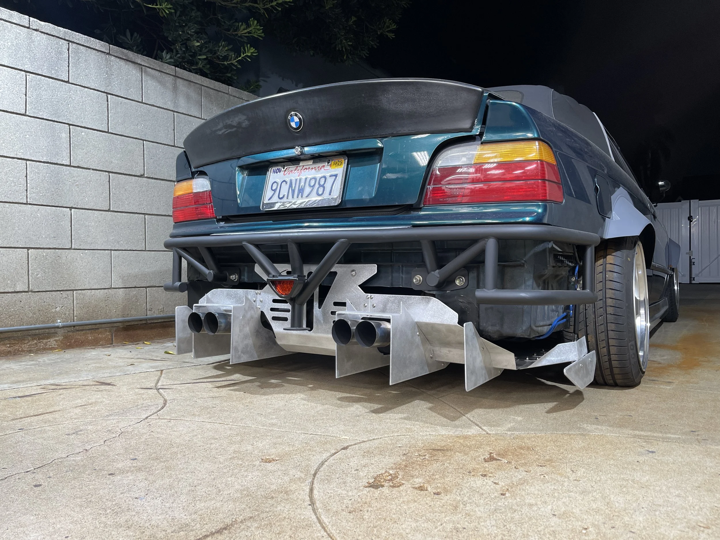 Long days…and longer nights - burning the midnight oil. I was able to get the lower most portion built out and flush with the underside of the chassis from the diff back, and from driver to passenger tire. It has a few ‘breaks’ in its structure as it moves upwards and back towards the trunk. Solid mounting was built in for a rigid and overall study structure. As the overall diffuser started to take shape, I built tabs and adjustable tierods off the OEM bumper slider mounts. These allow for side stability and adjustment of the winglets behind the tires.