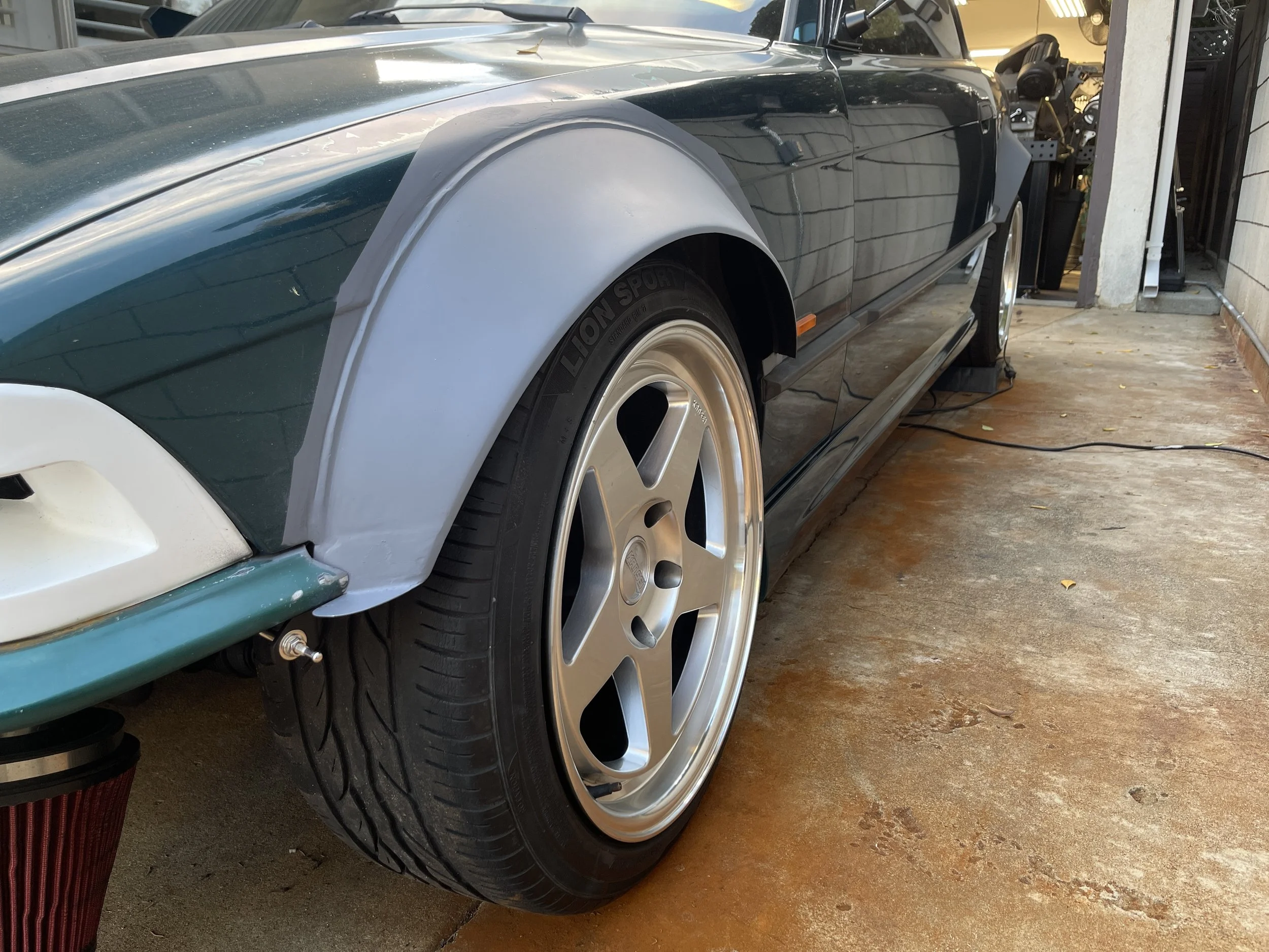 Now beings the process of fitting the new fenders around each corner. I started off by first leveling out the car, squaring everything up and mounting each fender with clecos. Trimming away at the fat, I ended up with an opened up wheel arch that would soon be covered by the new fenders.