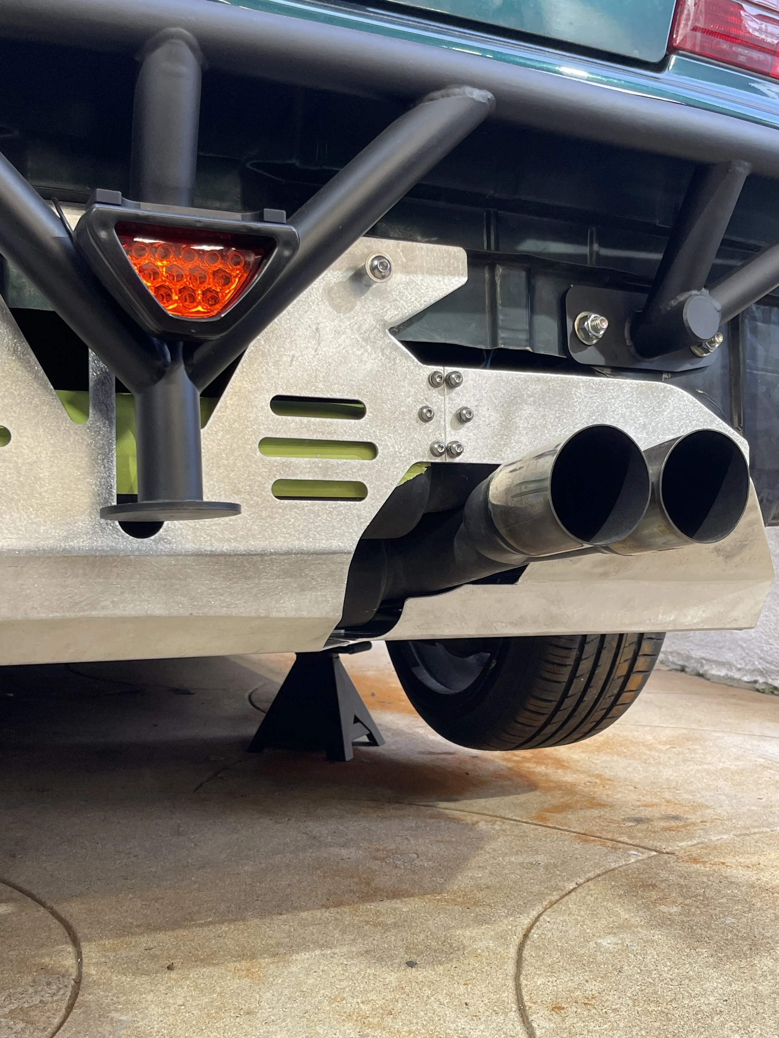 I started off by first building out templates of everything, exact but not EXACT. With the lower ‘tray’ built out under the car, I could move more rear ward and start mocking up the rear vertical plane, and began on the fins and their respective placement. The plan is to have 2 fins on the outermost edges, and 4 vertical fins (connected at the top) as pairs housing each pair of exhaust tips.